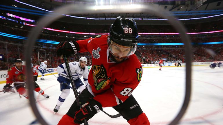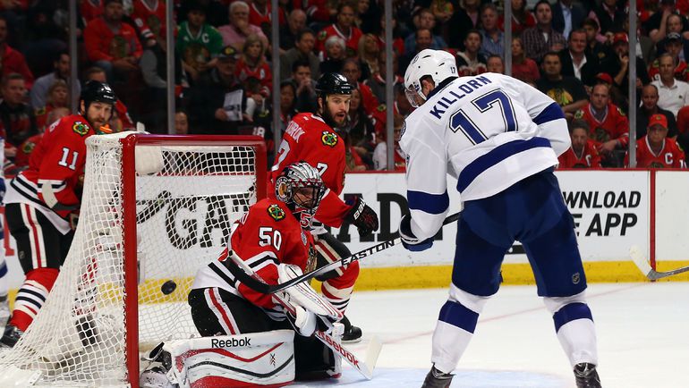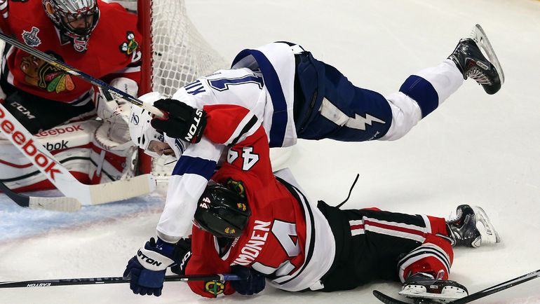 НХЛ. Плей-офф. Финал. Четвертый матч. "Чикаго" – "Тампа-Бэй" – 2:1 (0:0, 1:1, 1:0). Голы: Тэйвз – 10 (Шарп, Хосса), 26:40 – 1:0. Киллорн – 9 (Филппула, Стэмкос), 31:47 – 1:1. Саад – 8 (Кейн), 46:22 – 2:1. Фото AFP, REUTERS