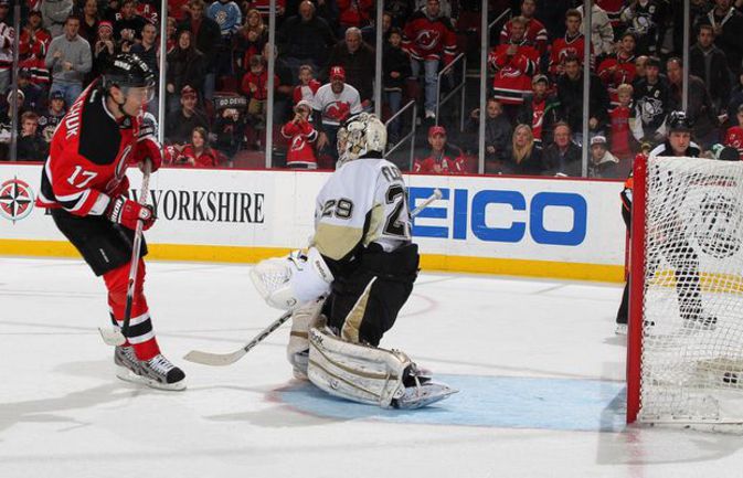 Матч в Ньюарке начался одновременно с боем курантов в Москве. Перед встречей как будто ни с того ни с сего Ковальчук обсудил с главным тренером "Дэвилз" Питером Дебуром вопрос исполнения буллитов. И в первом периоде ранее полученное разрешение ему пригодилось. После попадания Ларссона в штангу шайба свалилась на пятачок Флери, откуда Элиаш с Ковальчуком пытались дослать ее в цель. Им, а также Паризе как могли мешали распластавшийся вратарь и его защитники. Орпик в сутолоке завалился на шайбу, за что "Пингвинз" и наказали. Россиянин бросил низом под щитками голкипера. Так 17-й номер хозяев открыл счет, реализовав второй при трех попытках штрафной бросок в своей заокеанской карьере, и провел 12-й гол в сезоне.