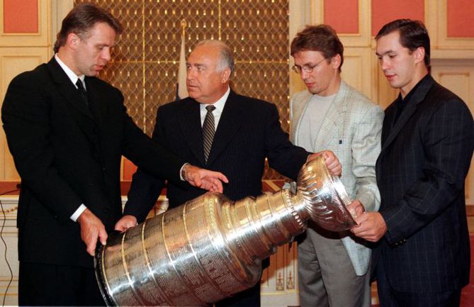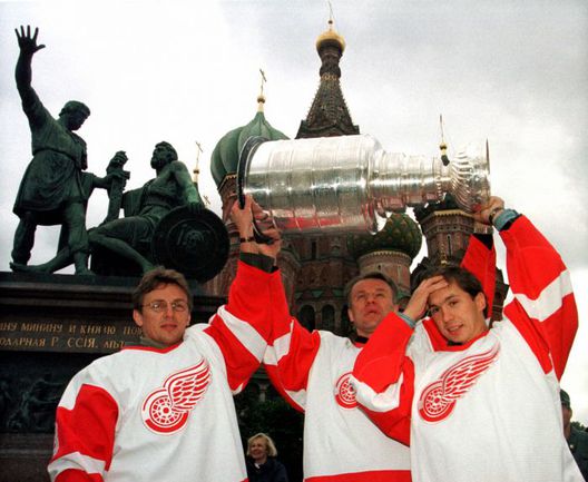 "Детройт" должен был выиграть Кубок в 1995-м, когда Сергей Федоров, Пол Коффи и Стив Айзерман были размазаны по бортам стихийным бедствием из Нью-Джерси. В 1996-м, с приходом Игоря Ларионова и созданием "Русской пятерки", красно-белые стали, наверное, лучшей "регулярной" командой в истории лиги, установив рекорд по победам (62) и второй результат по очкам (131). Ни у кого в лиге не было лучшей защиты: скоростной и атакующий Коффи, молодой, но уже мастеровитый Никлас Лидстрем, опытный Вячеслав Фетисов, мощный и устрашающий Владимир Константинов. Федоров, набравший более 100 очков, находил время подключаться к обороне, да так, что заработал свой второй "Трофей Селке".