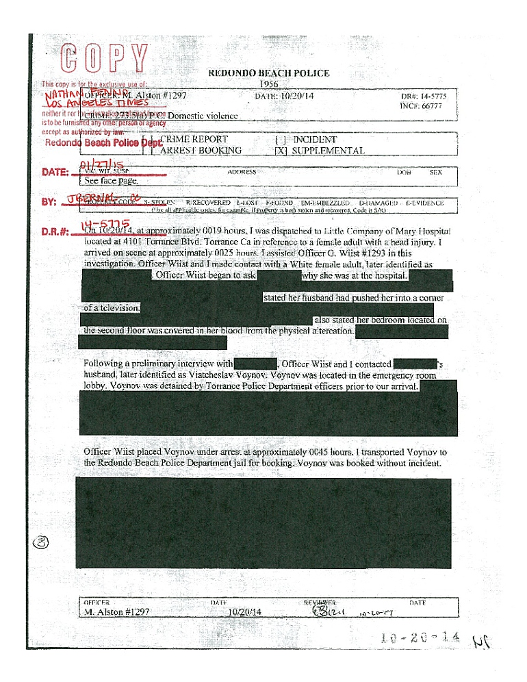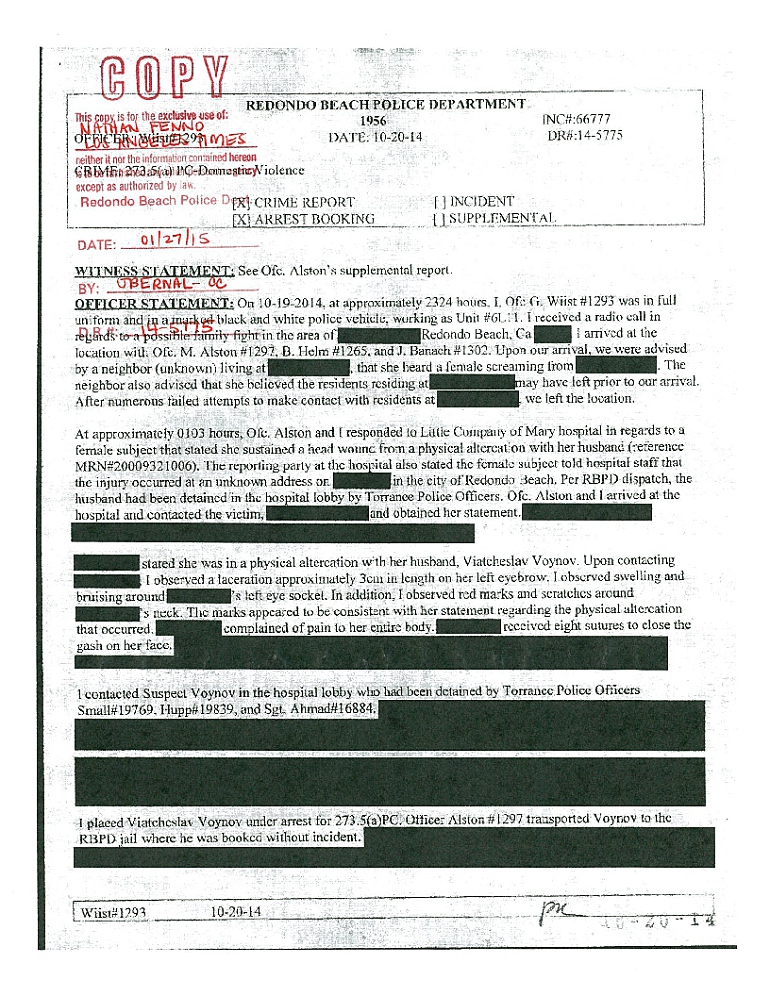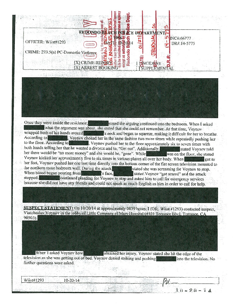 Ведущее калифорнийское издание Los Angeles Times после официального запроса в полицейский офис в Редондо Бич получило копию отчета, в котором подробно описывается инцидент в ночь с 19 на 20 октября. Главный вывод: Войнов якобы сказал жене, что "он хочет развестись" и "больше не даст никаких денег", а также нанес супруге несколько ударов во время ссоры. Именно это обернулось для российского легионера обвинением в уголовном преступлении.