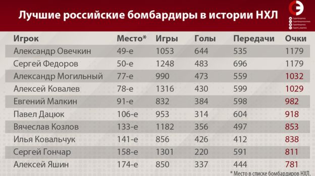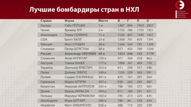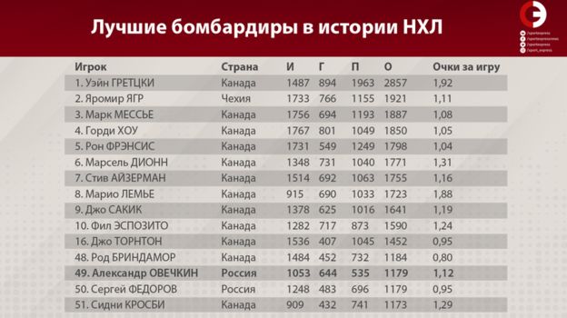 Россия, несмотря на смену главного бомбардира в истории, по-прежнему занимает седьмое место по лучшему результату своего лидера. Выше помимо Канады и Чехии (первое и второе места Гретцки и Ягра) располагаются Финляндия, США, Швеция и даже Словакия, результат представителя которой Петера Штястны сейчас является одним из приоритетов для Александра Овечкина.