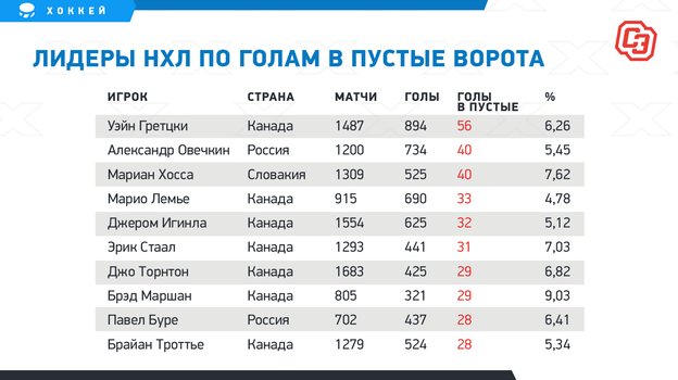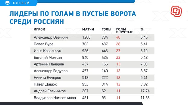 Кроме Овечкина, более 20 голов в пустые ворота забили три российских игрока — Павел Буре, Илья Ковальчук и Евгений Малкин. Примерно в одно время с Ови отличился и Владислав Наместников, вошедший в отечественные топ-10. Кстати, форвард «Детройта» в пустые ворота забросил почти 12 процентов своих голов. У Андрея Свечникова, кстати, этот показатель близок к 18 процентам.