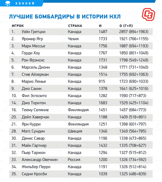 Вместе с тем Овечкин поднялся на 33-е место в списке лучших бомбардиров в истории лиги, подвинув выдающегося канадца Жильбера Перро. От попадания в европейскую тройку (третий сейчас Яри Курри) Овечкина сейчас отделяет 72 очка, а вот от топ-10 — аж 264. Среди действующих игроков капитан «Вашингтона» идет вторым, на одно очко опережая Сидни Кросби и на 203 отставая от суперветерана «Флориды» Джо Торнтона.
