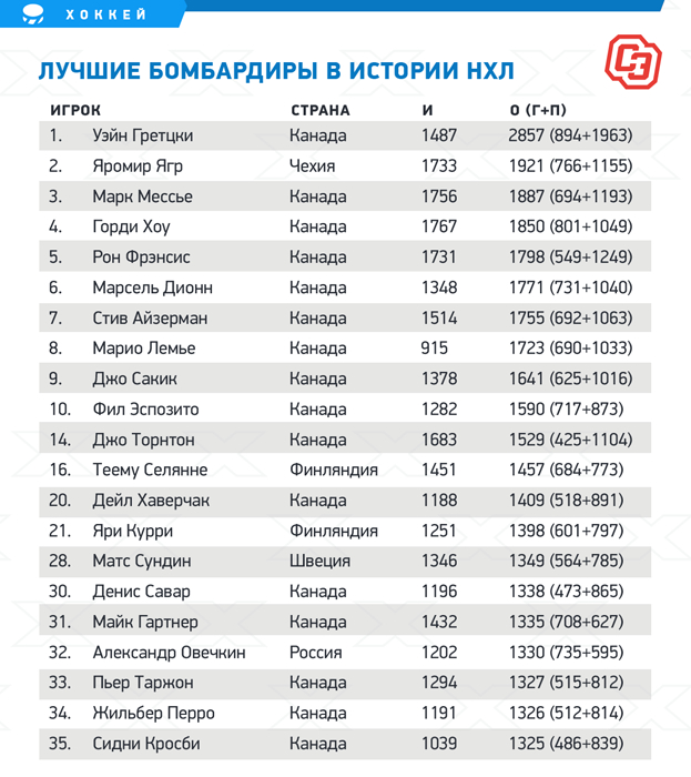 Кстати, от попадания в европейскую тройку (третий сейчас Яри Курри) Овечкина сейчас отделяет 68 очков, зато от рекорда Старого Света — аж 591. Среди действующих игроков капитан «Вашингтона» занимает второе место с 199-очковым отставанием от Джо Торнтона, выступающего ныне за «Флориду».