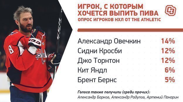 Овечкин обошел Сидни Кросби и Джо Торнтона (их относят к легендам и хотят узнать поближе), Кита Яндла и Брента Бернса (это приятные парни), а также двух братьев Марка и Джордана Стаала (от неизвестного центра «Миннесоты», особенно просившего сохранить его имя анонимным, и которым явно является старший из братьев — Эрик Стаал).