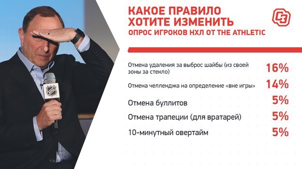 Топ-5 возглавило предложение отменить удаления за выброс шайбы (из своей зоны за стекло). При этом у хоккеистов было порядка 80 вариантов ответа. От конструктивных до странных.
