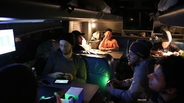 В 23.00 кто-то вновь начинает устраиваться на ночлег. В конце автобуса игроки достают карты и видеоигры.