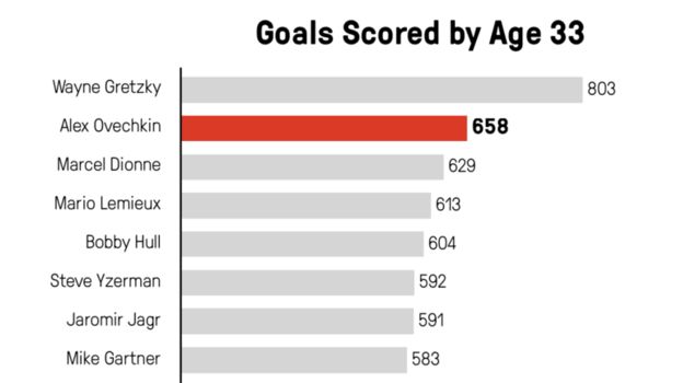 Когда пару сезонов назад россиянин забил всего 33 гола, то показалось, что его годы в статусе элитного снайпера подошли к концу. Однако он смог вернуться на вершину и продолжает уверенно подниматься в списке лучших снайперов в истории НХЛ. Ни один игрок не забивал 100 шайб в сезонах, когда ему было 32 и 33 года. Овечкин только что это сделал.