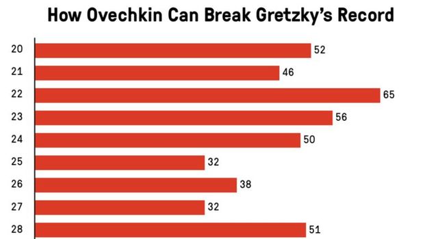 Принимая во внимание всю возможную статистику, предполагая, что его игровое время начнет снижаться и что он продолжит проводить также много матчей (за карьеру Ови провел 97 процентов игр из возможных 100), можно ожидать, что за следующие два сезона нападающий не опустится ниже показателя 40 голов за регулярку. Потом 2-3 года с 30 шайбами и выше, а потом снижение результативности, когда его возраст начнет приближаться к 40 годам. Если эта теория верна, то Александру нужно провести еще восемь сезонов, чтобы побить рекорд, что случится тогда для него в возрасте 41 года.