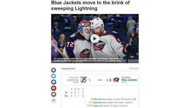 "Коламбус", который по ходу регулярки отстал от "Тампы" на 30 очков, одержал очередную победу (3:1) и повел в серии со счетом 3-0. Через день "Жакеты" могут закончить мучения соперника.