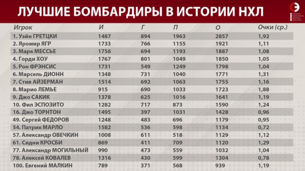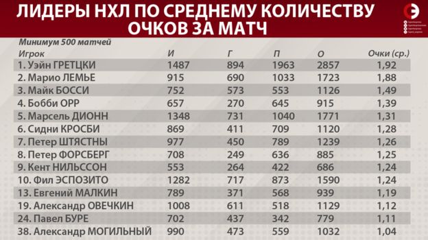 Всего девять хоккеистов, которые входят в топ-100 лучших бомбардиров лиги за всю историю, провели в регулярных чемпионатах менее 1000 матчей. И лишь двое из них – Малкин и канадец Майк Босси – сыграли меньше 800 встреч.