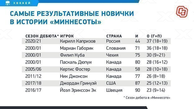 Кирилл Капризов, открыв счет в матче против «Аризоны» (5:2), набрал 37-е очко в текущем сезоне и установил рекорд для новичков «Миннесоты». Предыдущее достижение принадлежало словаку Мариану Габорику и состоялось в сезоне-2000/01 — дебютном для «дикарей». Скорее всего, российский форвард в ближайшее время перепишет на себя снайперский и ассистентский рекорды для новичков команды. По голам (18) он уже сейчас делит лидерство все с тем же Габориком, а по передачам (19) незначительно отстает от чеха Филипа Кубы (21).