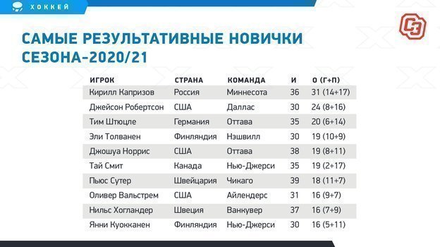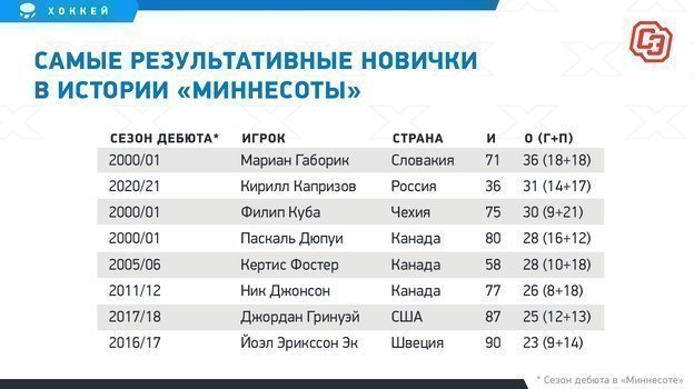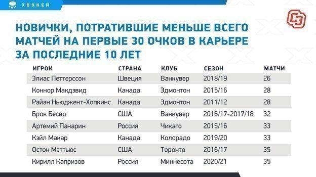 В двух матчах против «Вегаса» Кирилл Капризов принял участие в трех из четырех голевых атак «Миннесоты» и стал восьмым за последние десять сезонов новичком НХЛ, которому удалось набрать первые 30 очков в лиге быстрее чем за 36 матчей. Такой же результат — 35 матчей на 30 баллов — в сезоне-2016/17 установил нынешний лидер снайперской гонки Остон Мэттьюс. Артемий Панарин мини-юбилей отпраздновал в 33-й встрече, Коннор Макдэвид — в 28-й, Элиас Петтерссон — в 26-й.