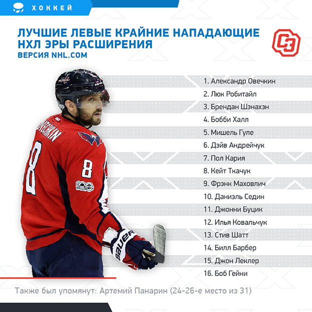 Еще один рейтинг лучших левых крайних нападающих НХЛ сайт лиги представил весной: топ-16 назывались за эру расширения с 1967 года, Овечкин победил с заметным преимуществом, 12-м стал Илья Ковальчук, Панарин тоже был упомянут и разделил 24-26-е места из 31.