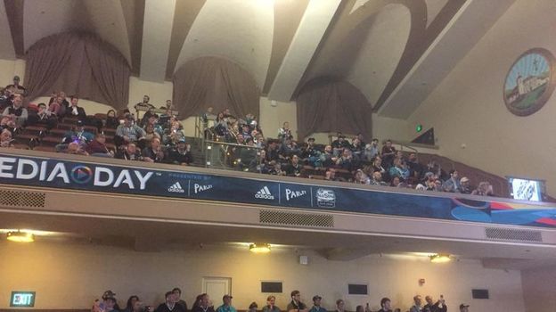 ...22 года спустя все будет совсем иначе. Журналистов и игроков приведут в концертный зал нарядного исторического здания Гражданского центра Сан-Хосе, построенного в 1934 году. Колонны, арки, купол, красивые фонари — как-то все по-европейски, а не по-американски. А внутри — два яруса трибун, сцена, а в партере — начищенный до полярного блеска, словно целой ротой солдат советской армии, паркет. И на нем — media day, проходящий… в присутствии болельщиков!