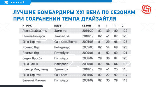 Тем не менее, Драйзайтль сейчас является фаворитом бомбардирской гонки века. Если немец сохранит взятый темп, то к концу чемпионата наберет 129 очков и побьет рекорд нового столетия, установленный в прошлом сезоне Никитой Кучеровым. За десятый результат века вполне могут побороться Давид Пастрняк и Артемий Панарин. Идущие пока на 113 очков.