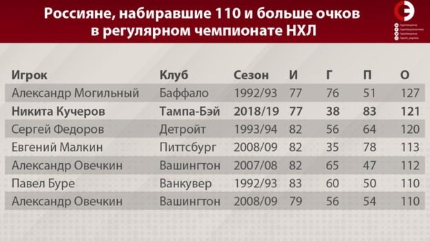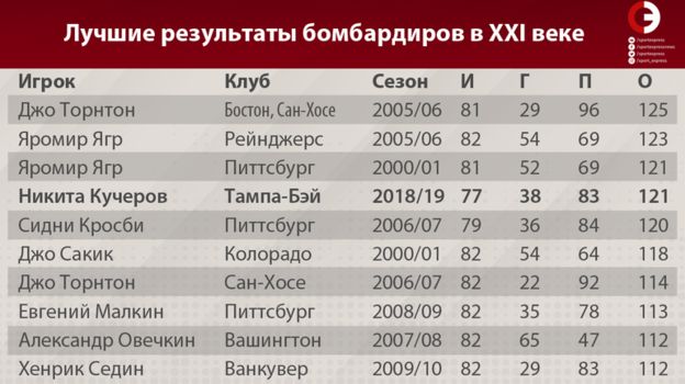 От повторения лучшего результата XXI века Кучерова на данный момент отделяет четыре очка. Выше результата российского форварда "Молний" в новом тысячелетии значатся только показатели Джо Торнтона и дважды Яромира Ягра.