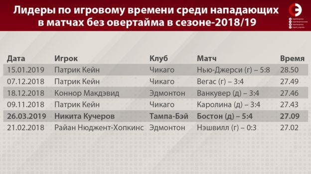 В матче с "Бостоном" Кучеров провел на льду 27 минут 9 секунд и более чем на минуту превзошел личный рекорд по игровому времени. Предыдущее достижение было установлено им в конце декабря 2015 года во встрече с "Ванкувером". Тогда он отыграл 26 минут и 1 секунду.