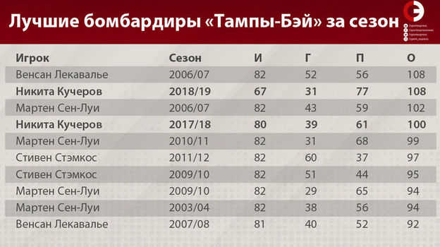 Никита Кучеров сделал две голевые передачи в матче с "Виннипегом" (5:2) и повторил рекорд "Тампы-Бэй" по очкам за сезон. Россиянин набрал 108 (31+77) очков в 67 играх сезона и сравнялся с результатом Венсана Лекавалье, который в сезоне-2006/07 добавил к 52 голам 56 голевых передач.