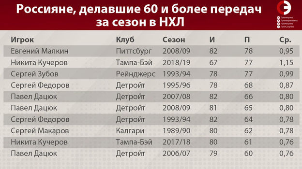 Россияне, делавшие 60 и более передач за сезон в НХЛ. Фото "СЭ"