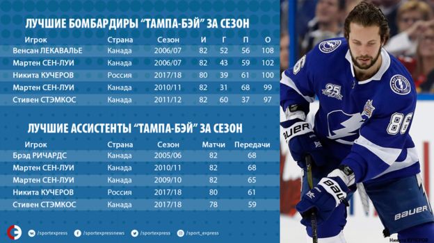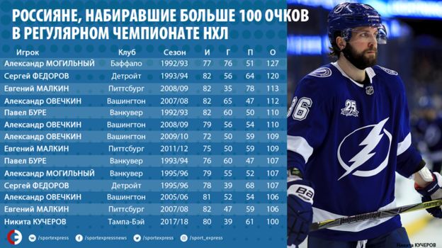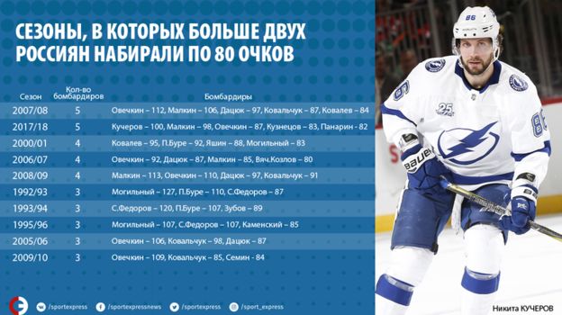 Главная российская звезда как минимум первой части чемпионата Никита Кучеров из "Тампа-Бэй" набрал по итогам сезона 100 (39+61) очков и составил компанию в списке российских "сотников" великим – Александру Могильному, Павлу Буре, Сергею Федорову, Александру Овечкину и Евгению Малкину. Личный максимум по набранным очкам он превысил на 15 пунктов, а по результативным передачам – на 16 (достижения были датированы сезоном-2016/17). По голам себе прошлогоднему он проиграл, отправив в ворота на шайбу меньше.