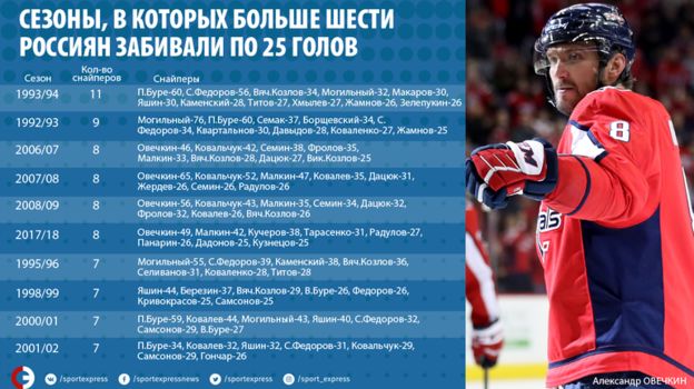 Завершившийся регулярный чемпионат НХЛ стал одним из самых успешных для российских легионеров в истории. Сразу восемь российских форвардов забросили больше 25 шайб, причем Александр Овечкин выиграл уже седьмой для себя "Морис Ришар Трофи". Столько же снайперов с российским паспортом проявляли себя в сезонах-2006/07, -2007/08 и -2008/09. А в чемпионатах-1993/94 и -1992/93 до отметки 25 голов добирались соответственно 11 и 9 наших соотечественников.