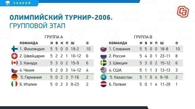 * Россия стала второй в своей группе после матчей со Словакией (3:5), Швецией (5:0), Латвией (9:2), Казахстаном (1:0) и США (5:4). Словаки в последний игровой день предварительного раунда победили будущих олимпийских чемпионов шведов и прошли группу без поражений.