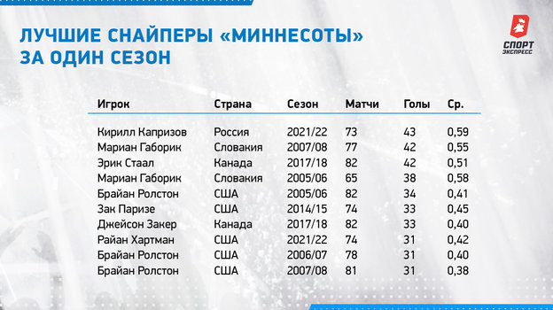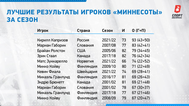 24-летний российский нападающий снова обновил рекорд «Миннесоты» по количеству очков за сезон. В 73 матчах он набрал 93 (43+50) балла — на десять больше, чем Габорик в сезоне-2007/08. Кстати, Зуккарелло с 74 (22+52) баллами занимает пятое место в истории, уступая, помимо Капризова и Габорика, только Брайану Ролстону и Эрику Стаалу, а швейцарец Кевин Фиала — седьмой.