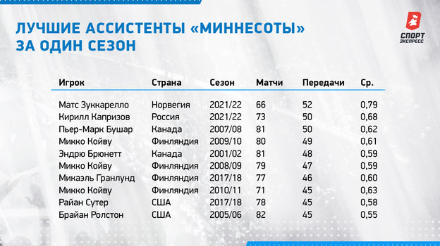 Заодно Кирилл повторил достижение Пьера-Марка Бушара, который 14 лет назад сделал 50 голевых передач. Тем не менее этот результат не стал рекордным для франшизы. Партнер Капризова по звену Матс Зуккарелло ассистировал партнерам 52 раза.