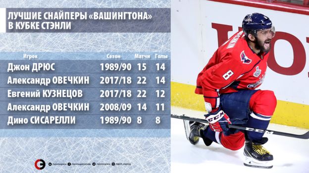 В третьем матче финальной серии против "Вегаса" Александр Овечкин забил 14-й гол в текущем розыгрыше Кубка Стэнли и повторил снайперский рекорд "Вашингтона". Правда, Джону Дрюсу в 1990 на 14 голов понадобилось 15 матчей, тогда как Овечкин добрался до этой отметки в 22-м.