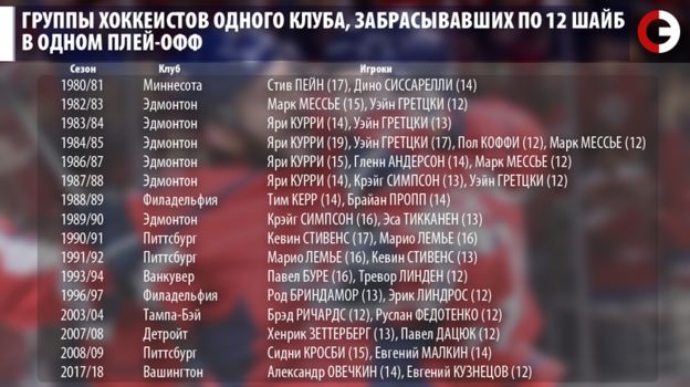 Каждый из российских форвардов "Вашингтона" уже забил по 12 голов в Кубке Стэнли-2018. Это первый с 2009 года случай, когда два игрока одной команды записали на свой счет по 12 шайб. Девять лет назад таким образом отметился дуэт форвардов "Питтсбурга" – Кросби – Малкин. А в 1984 году по дюжине голов записали на свой счет сразу четыре хоккеиста "Эдмонтона".