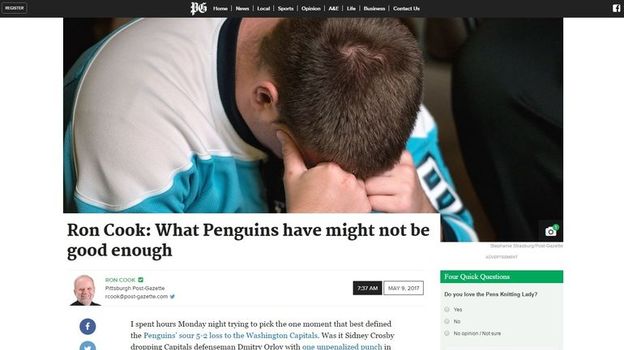 Я долго размышлял над тем, какой момент лучше всего олицетворяет провальную игру "Питтсбурга" в шестом матче серии. Был ли момент, когда Кросби ударил Орлова, за что должен был получить штраф? Или тишина на трибунах домашней арены "Пингвинов"? Или свист болельщиков, когда "Пингвинз" растратили три большинства, просто гоняя шайбу по периметру? Или появляющиеся на арене пустые места после третьего гола Никласа Бэкстрема?