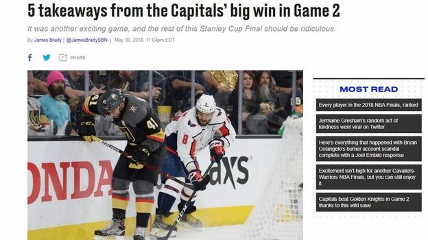 За пару минут до окончания второго матча серии голкипер "Кэпиталз" в каком-то неимоверном полете в последний момент выбросил клюшку и остановил шайбу, которая уже летела в ворота после броска нападающего "Вегаса" Алекса Така. Это спасло "Столичных" и позволило им удержать победный счет в матче – 3:2.
