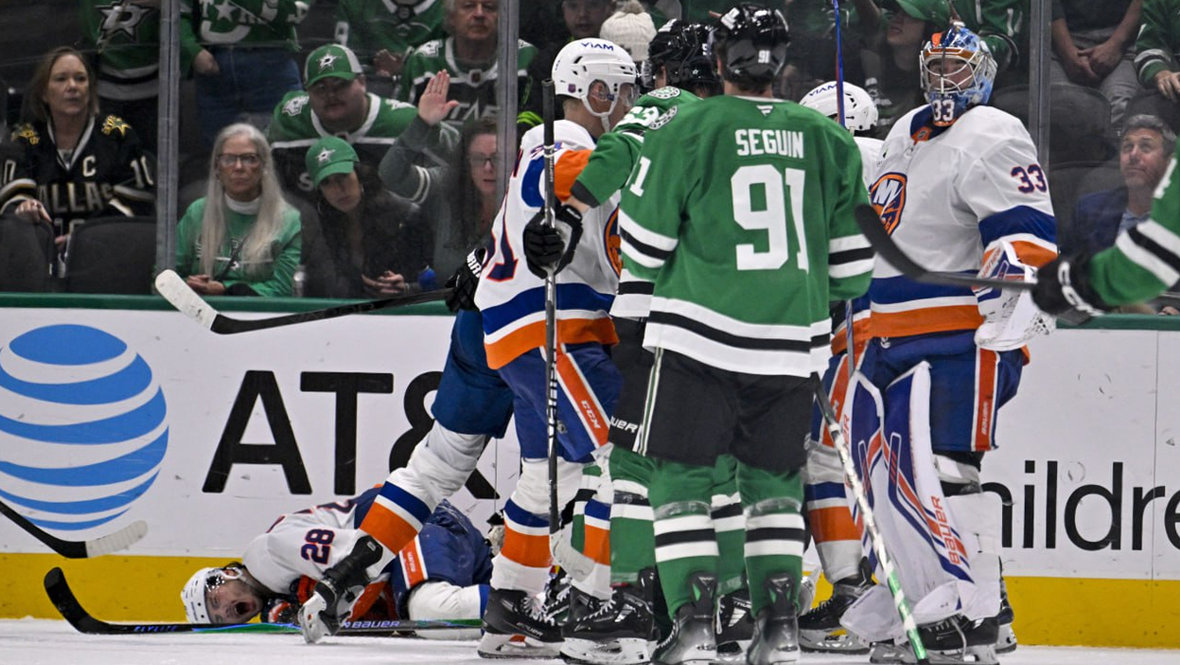 Еще один скандальный эпизод в матче произошел за 0,1 секунды до финальной сирены. «Даллас» все же забросил шайбу, которая должна была перевести встречу в овертайм, но перед этим Джейсон Робертсон буквально снес вратаря «Айлендерс». Судьи посмотрели повтор эпизода и гол отменили.
