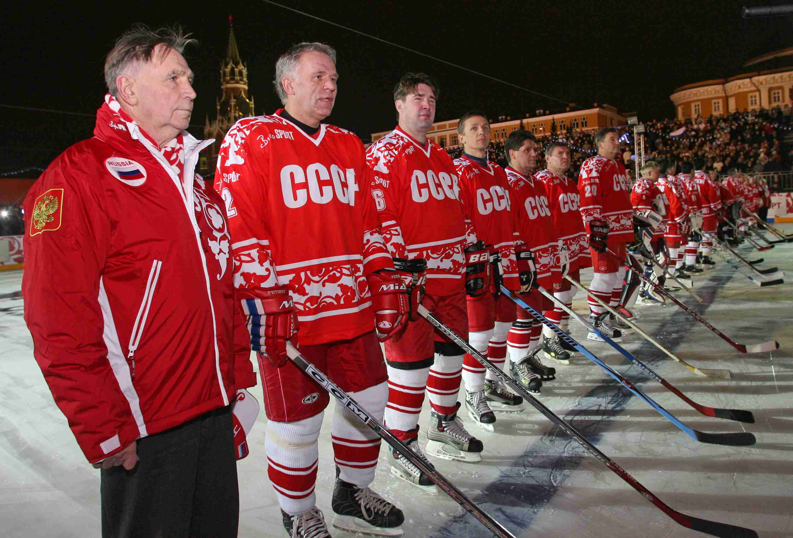 9 декабря 2006 года. Москва. Красная площадь. Сборная СССР - сборная мира - 10:10. Виктор ТИХОНОВ и его великолепная пятерка и вратарь: Вячеслав ФЕТИСОВ, Алексей КАСАТОНОВ, Игорь ЛАРИОНОВ, Сергей МАКАРОВ, Владимир КРУТОВ, Владислав ТРЕТЬЯК. Фото - Александр ВИЛЬФ