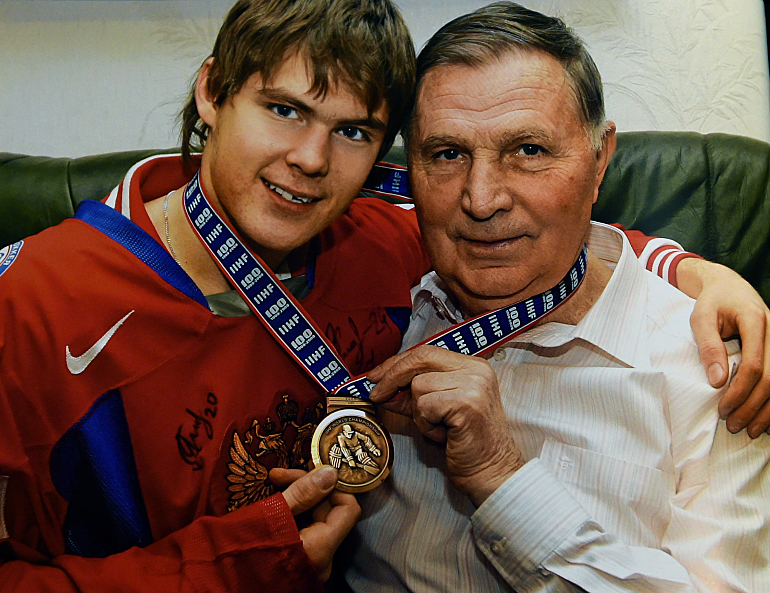 Виктор Васильевич с внуком Виктором, лучшим нападающим МЧМ-2008. Фото photo.khl.ru