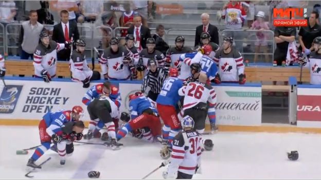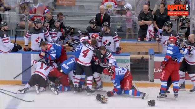 Любушкин активно атаковал канадского голкипера, и сразу четверо его партнеров поехали мстить после свистка. Судьи погасили конфликт массовыми удалениями.