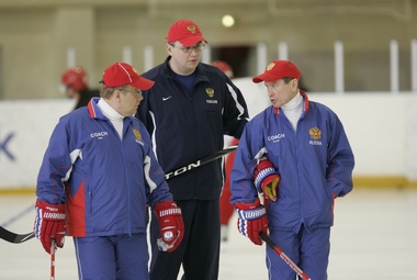 В 17.25 хоккеисты вышли туда, куда им и положено. На лед. Три тренера - Вячеслав Быков, Игорь Захаркин и Андрей Назаров - выстроились в центре площадки и на старте занятия предложили хоккеистам поучаствовать в небольшом конкурсе. Пробегая через всю площадку, Илья Ковальчук, Александр Фролов и Ко должны были не попасть в своеобразный тренерский капкан. Показалось, что в "Нью-Джерси" Ковальчука, обожающем ловушки в средней зоне, не глядя предложили бы контракт не только бывшим хоккеистам Быкову с Назаровым, но даже Захаркину, который вроде бы больше специализируется на теории хоккея.
