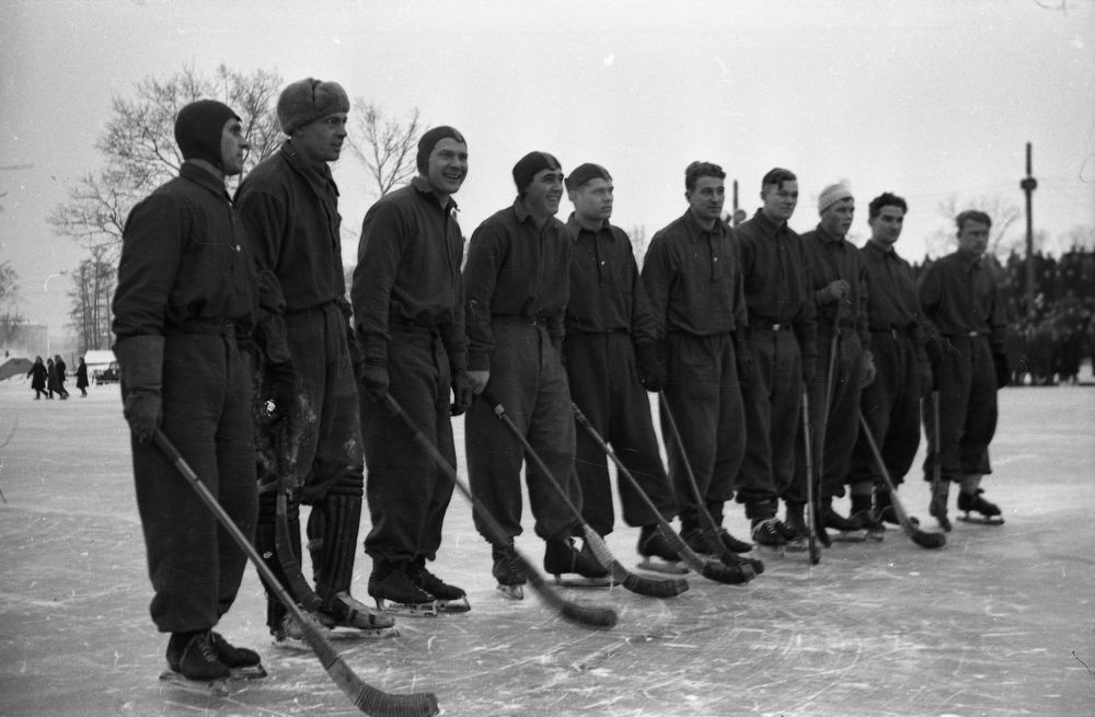 3. 1940 год. Анатолий Тарасов (шестой слева) и еще одна легенда отечественного хоккея – Всеволод Бобров (четвертый справа) – перед игрой на первенство Москвы по хоккею с мячом против "Динамо".