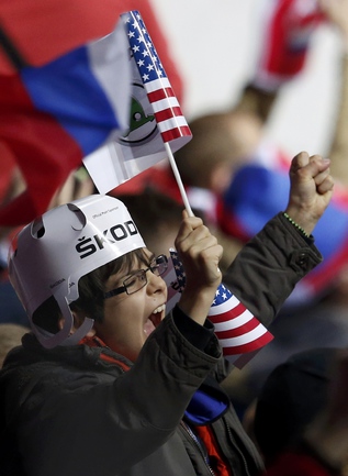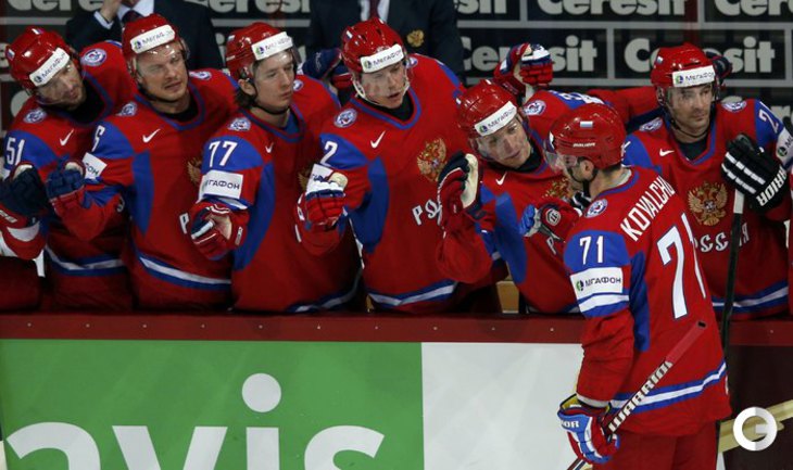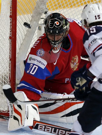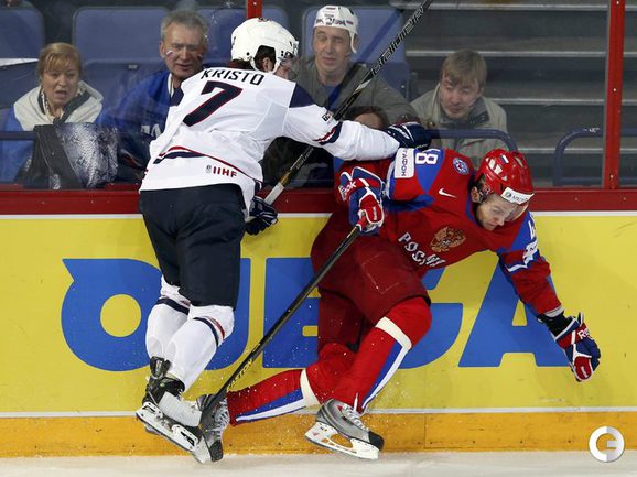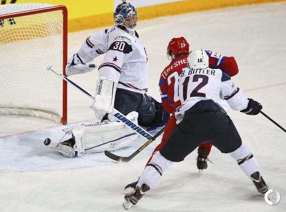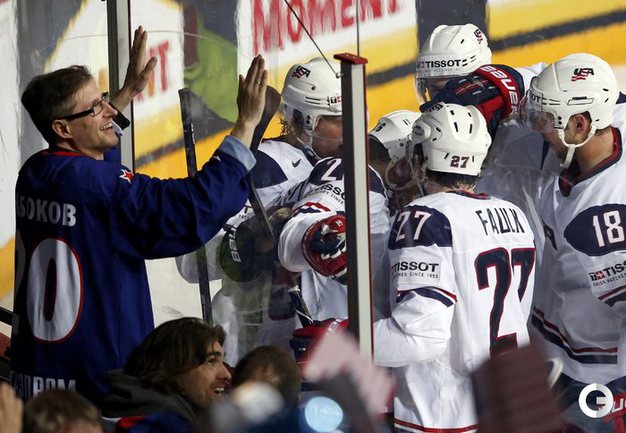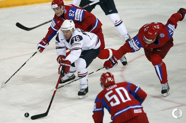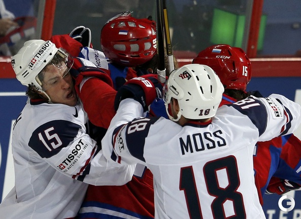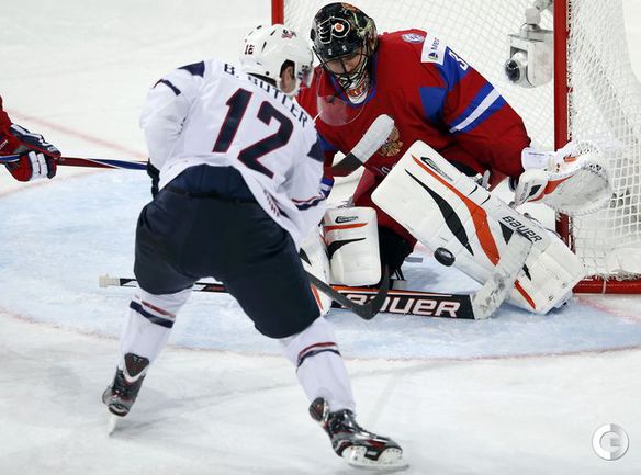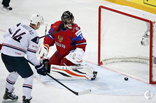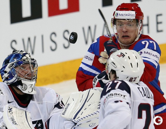 Хельсинки (Финляндия). Чемпионат мира. Групповой турнир. Группа В. РОССИЯ – США – 5:3 (2:2, 1:1, 2:0). Сборная России выиграла и третий матч на ЧМ-2013: после Латвии (6:0) и Германии (4:1) команда Зинэтулы Билялетдинова взяла верх над США – 5:3. Поведя в счете в дебюте поединка, обладатели титула-2012 потом дважды догоняли "звездно-полосатых", а в концовке третьего периода снова вырвались вперед. Фото - Григорий Дукор/ REUTERS