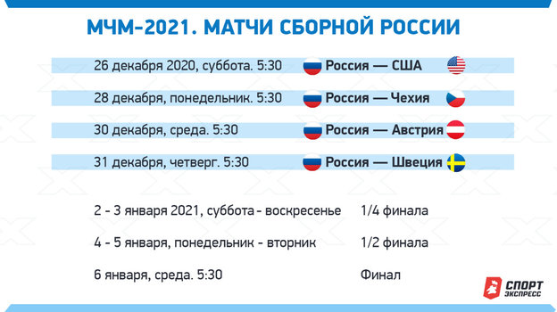 Российская команда проведет первый матч рано утром 26 декабря по московскому времени против США. Также команда под руководством Игоря Ларионова на групповом этапе 28 декабря сыграет с Чехией, 30 декабря — с Австрией, 31 декабря — со Швецией. Начало всех матчей — в 5:30 по московскому времени.
