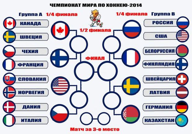 Победитель пары Россия – Франция (игра на "Минск-Арене" начнется в 18.00 по Москве) в полуфинале сыграет с победителем пары Швеция – Белоруссия (22.00). Две другие четвертьфинальные пары составили Канада – Финляндия ("Чижовка-Арена", 17.00) и США – Чехия (21.00).