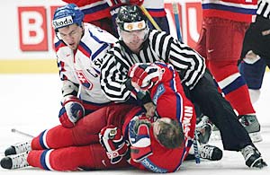 Все три гола россияне пропустили в меньшинстве. Палффи повезло с отскоком, когда шайба после щечка защитника, срикошетив от лицевого борта, оказалась на крюке у форварда, который отправил ее в ворота. Хосса воспользовался несогласованностью защитников на пятачке, а гол игрока обороны Вишновски был забит не без "помощи" Соколова, не справившегося с броском от синей линии, причем перед голкипером россиян не было помех. |