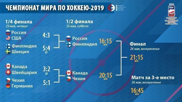 В 1/2 финала в субботу, 25 мая, играют Россия – Финляндия (16.15 мск) и Канада – Чехия (20.15 мск).