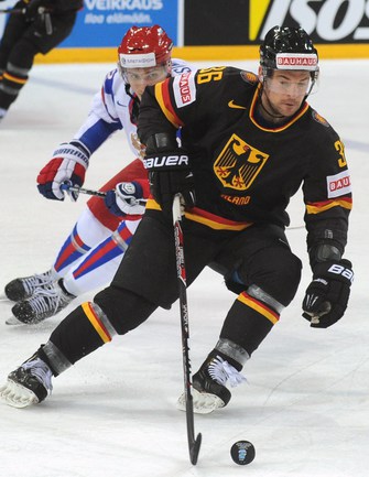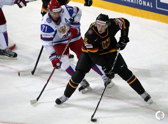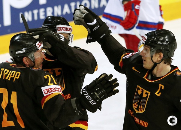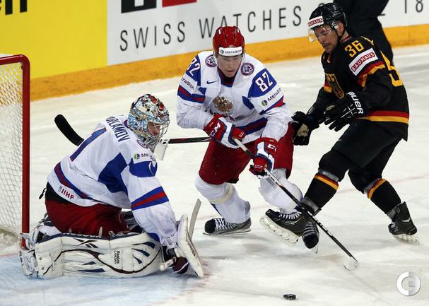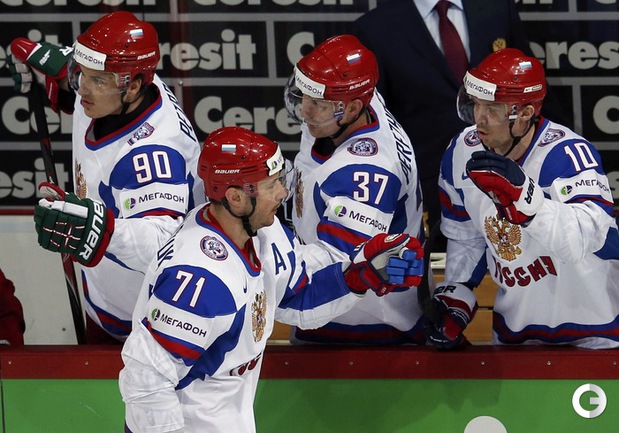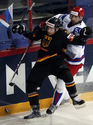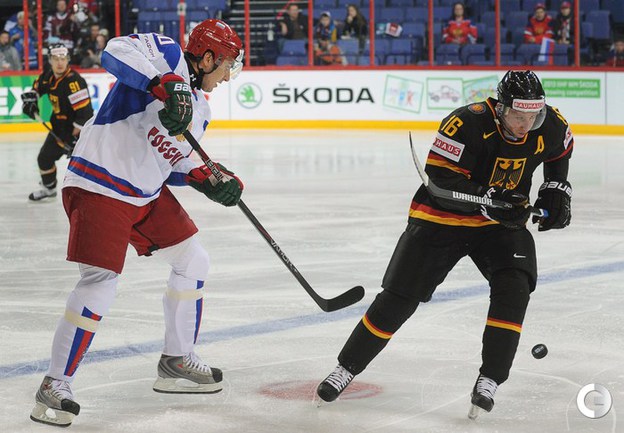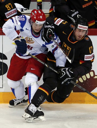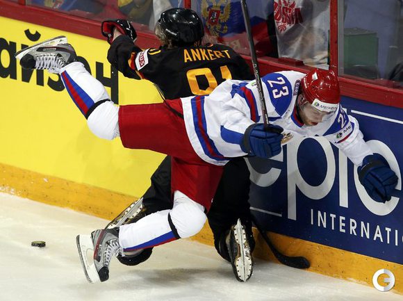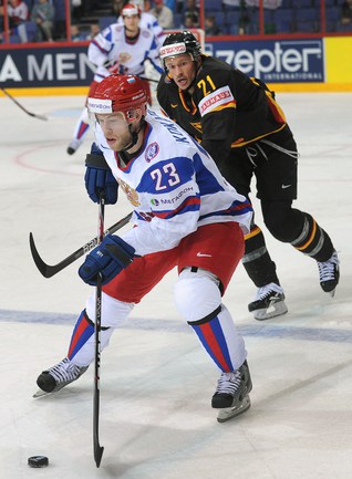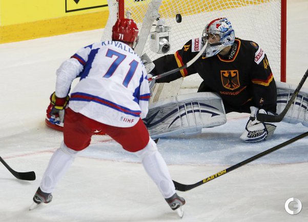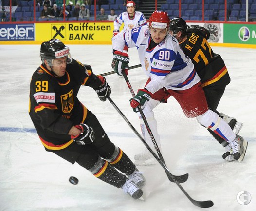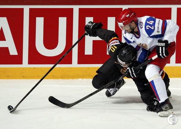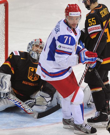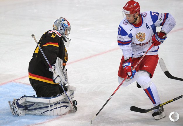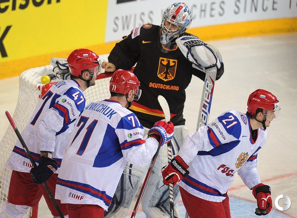 Хоккей. Стокгольм. Чемпионат мира. Групповой турнир. Группа B. 2-й тур. Германия – РОССИЯ – 1:4 (0:0, 0:2, 1:2). Голы: Ковальчук – 2 (Медведев), 23:20 (0:1). Ковальчук – 3 (Радулов), 30:09 (0:2). Трипп – 1 (Вольф, Эрхофф), 45:03 (1:2 – бол.). Ковальчук – 4 (Радулов, Медведев), 58:20 (1:3). Кокарев – 1 (Соин, Свитов), 59:39 (1:4 – п.в.). Сделав хет-трик в матче группового турнира ЧМ-2013 с Германией, форвард Илья Ковальчук возглавил список лучших снайперов сборной России на чемпионатах мира. В активе ассистента капитана теперь 28 шайб за 68 игр, что на две больше, чем у Александра Овечкина (55 встреч). Фото AFP и REUTERS