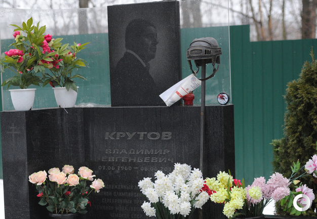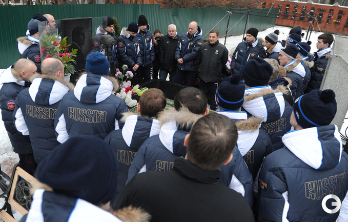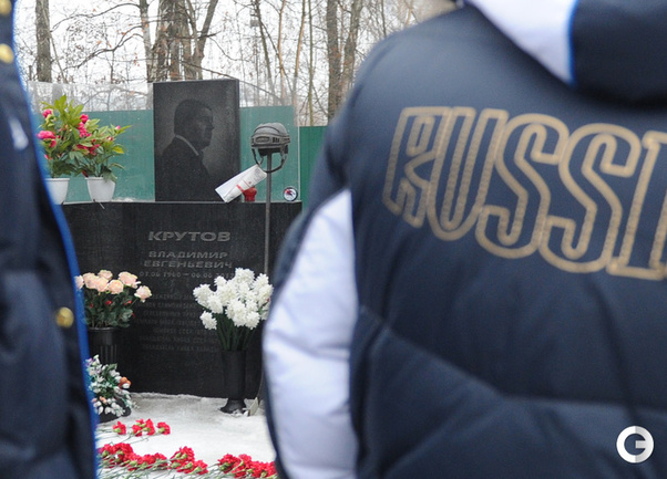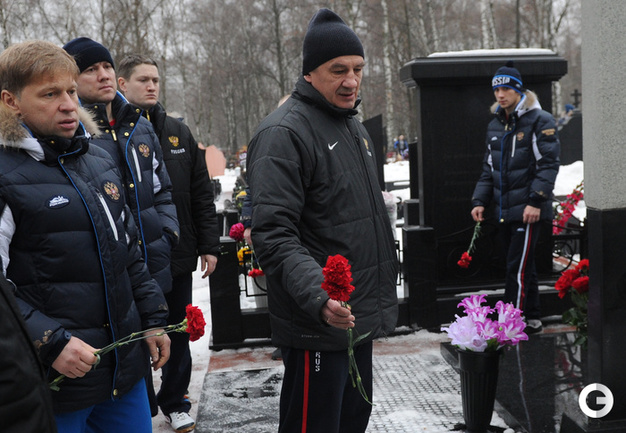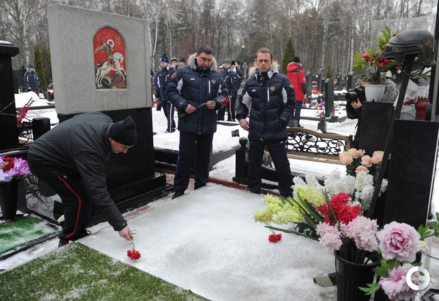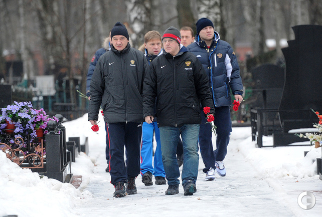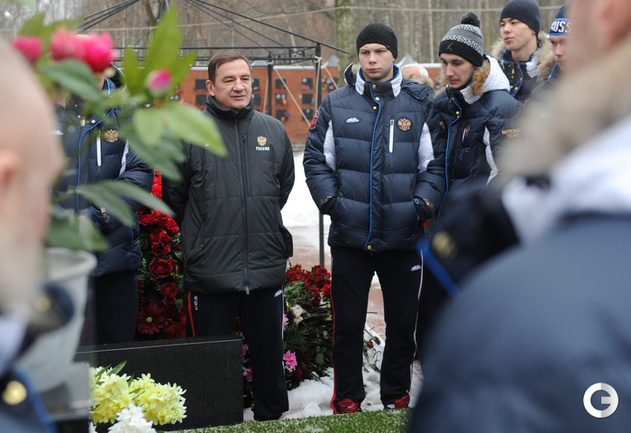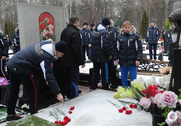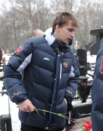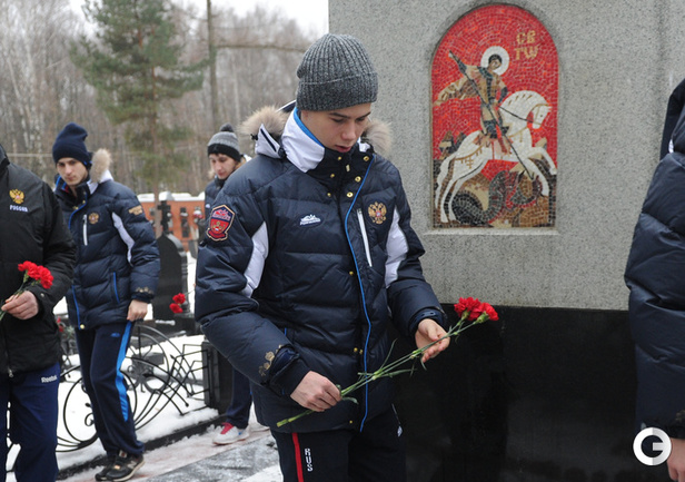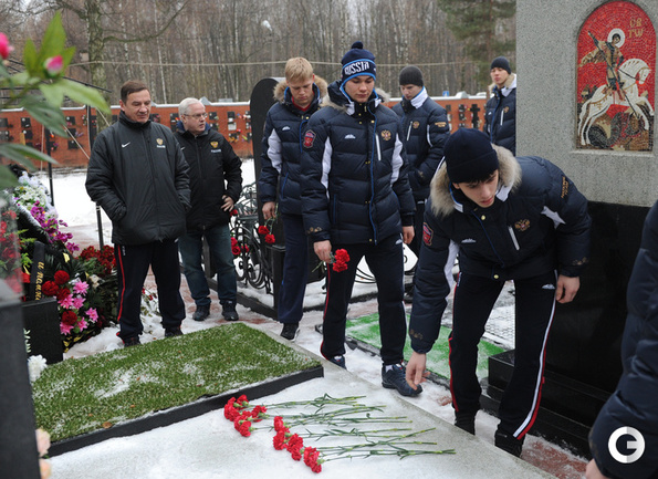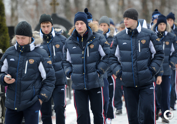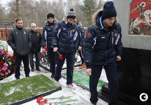 Химки. Хоккеисты молодежной сборной России посетили могилу Владимира Крутова перед вылетом на чемпионат мира. Фото Федор УСПЕНСКИЙ, "СЭ"
