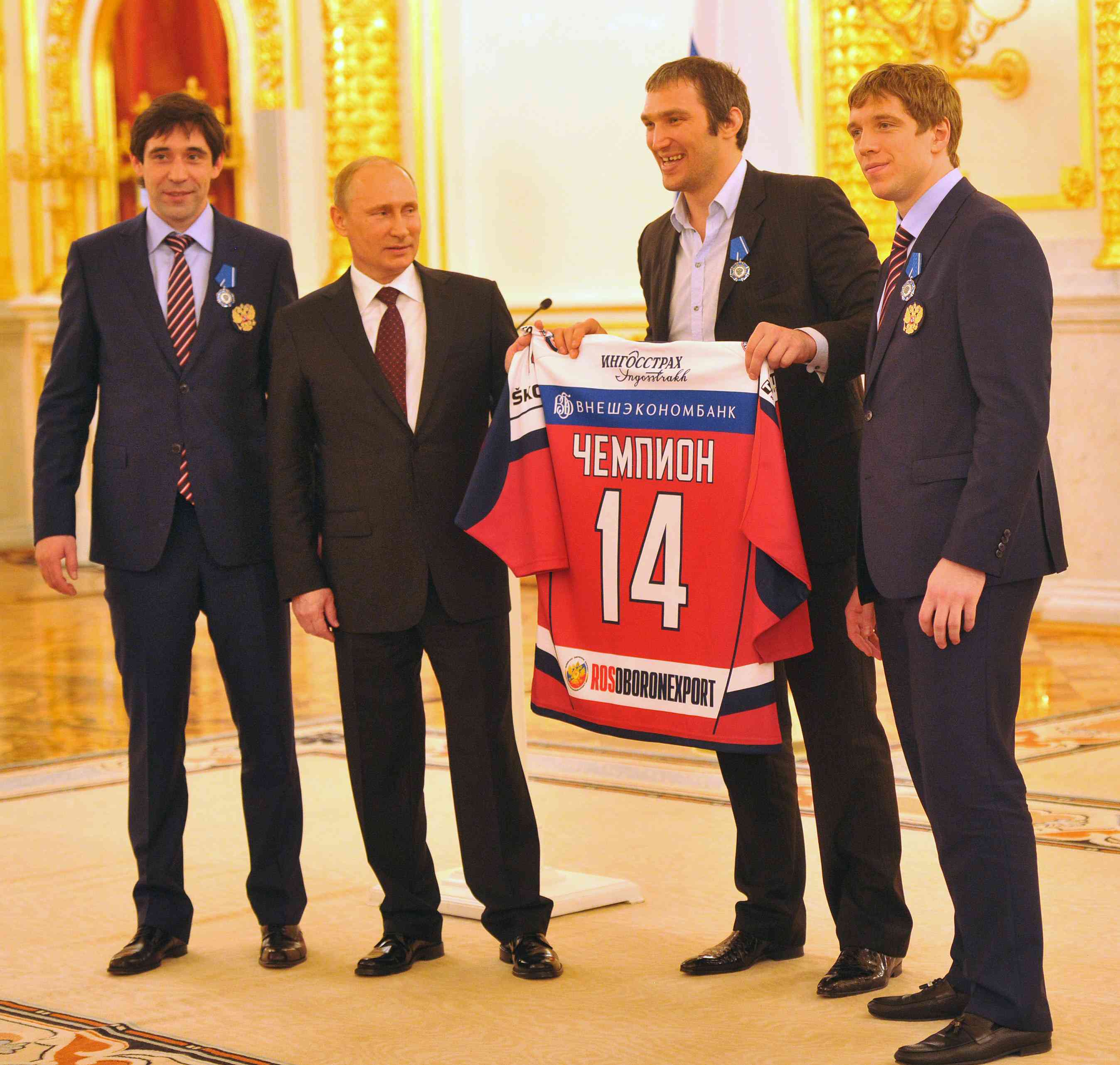 Капитан Овечкин вместе со своими ассистентами от имени команды вручили Путину свитер сборной с надписью "Чемпион" на спине и номером 14. На свитере стояли автографы всех триумфаторов-2014.