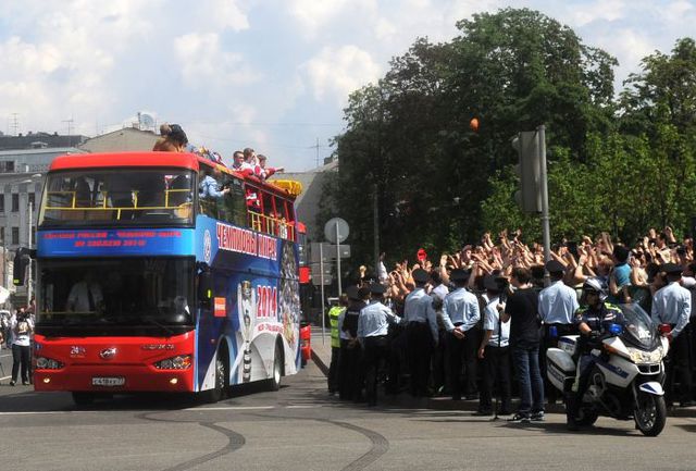 Болельщики рвались оказаться как можно ближе к автобусу. Ей богу, дай им волю, многотонную махину понесли б к Васильевскому спуску на руках. Но даже самым отчаянным удавалось лишь забросить игрокам свои майки, чтобы в ответ получить – все на тех же майках – автографы.