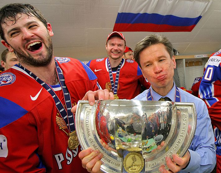 10 мая 2009 года. Берн. Россия - Канада - 2:1. Автор победной шайбы Александр РАДУЛОВ и Вячеслав БЫКОВ с чемпионским кубком. Фото - AFP