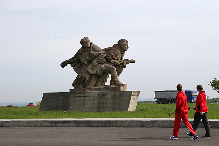 Сам монумент поражает масштабностью. На повороте, так чтобы было видно издалека, стоит старая гаубица. Чуть в отдалении памятник двум солдатам, судя по форме – русскому и чеху – и огромный мемориал, совмещенный с музеем. А за ним еще одна выставка техники – легендарные Т-34-85, пушки, самоходки. Все с опознавательными знаками Чехословацкого корпуса, который тоже принимал участие в боях за эти места. Памятник находится на возвышении и вокруг, до самого горизонта раскинулись поля, раскрашенные в зеленое и желтое. Ровно 70 лет назад эти поля были выжжены огнем и политы кровью.